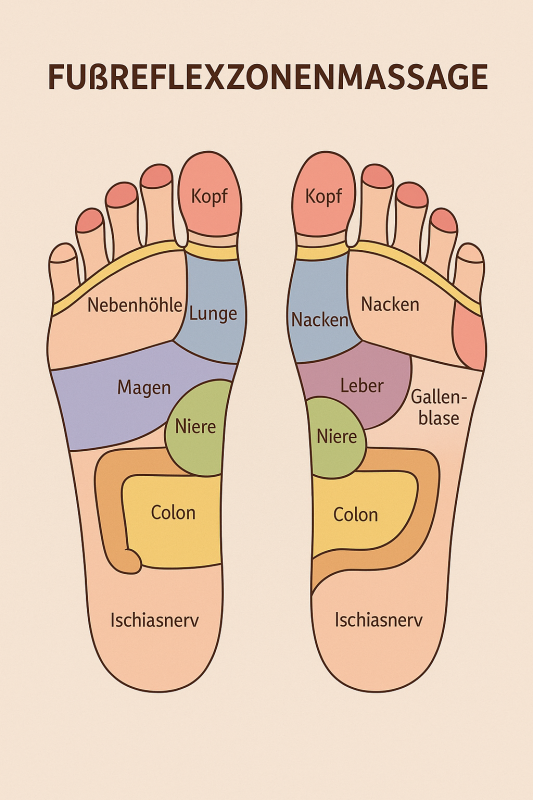 Die Fußreflexzonenmassage basiert auf der Vorstellung, dass bestimmte Bereiche der Füße mit inneren Organen und Körperfunktionen verbunden sind. Durch gezielten Druck auf diese Zonen können Blockaden gelöst und die Selbstheilungskräfte aktiviert werden.